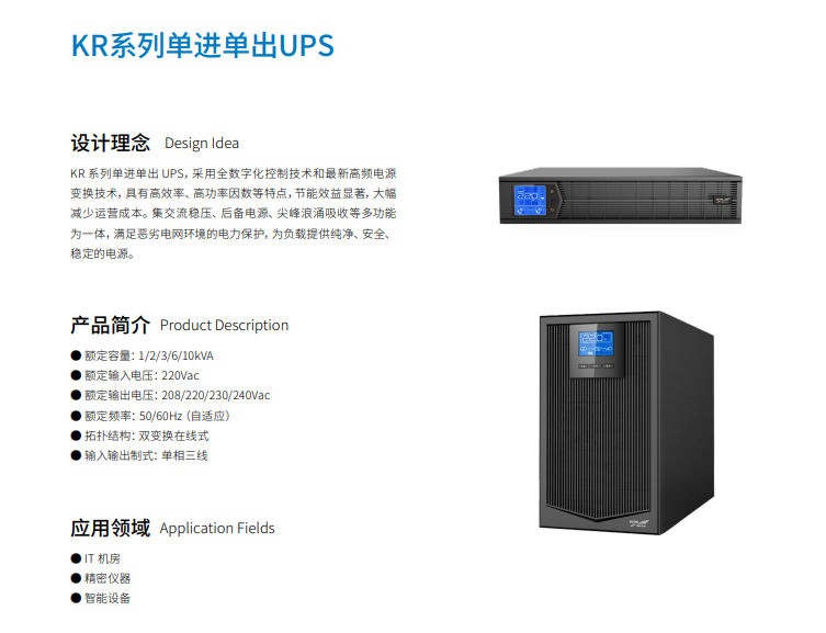 • KR11系列单进单出 UPS,采用全数字化控制技术和最新高频电源变换技术,具有高效率、高功率因数等特点,节能效益显著,大幅减少运营成本。集交流稳压、后备电源、尖峰浪涌吸收等多功能为一体,满足恶劣电网环境的电力保护,为负载提供纯净、安全、稳定的电源。适用场景IT 机房精密仪器智能设备